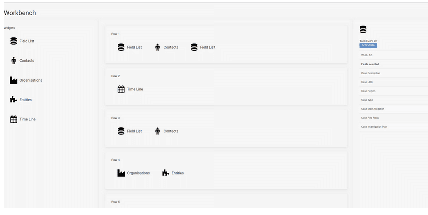 The above example is based on the case view shown on the previous page. You can control the width of each widget as well as the contents. You can fit as many as 6 widgets across on wide screens. When this renders to mobile devices, it puts only one widget across and displays them down the page. This is ‘responsive’ design that enables our case management tool to adapt to your device size.