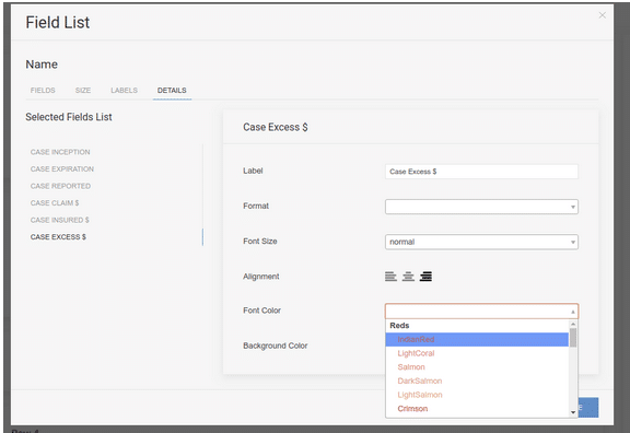 For example the field list enables alteration of individual fields including date/numeric formats, sizes, alignment and colors.