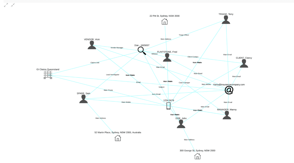 These capabilities will enable an Investigation Unit to visualise (or visualize if you prefer) the relationships between parties, vehicles, bank accounts, ownership, transactions, and anything else you care to add. This will be particularly helpful with understanding of Ring Fraud and other complex investigations. These diagrams are easy to include in a case report, currently you screenshot it but we’re thinking you might prefer a button?